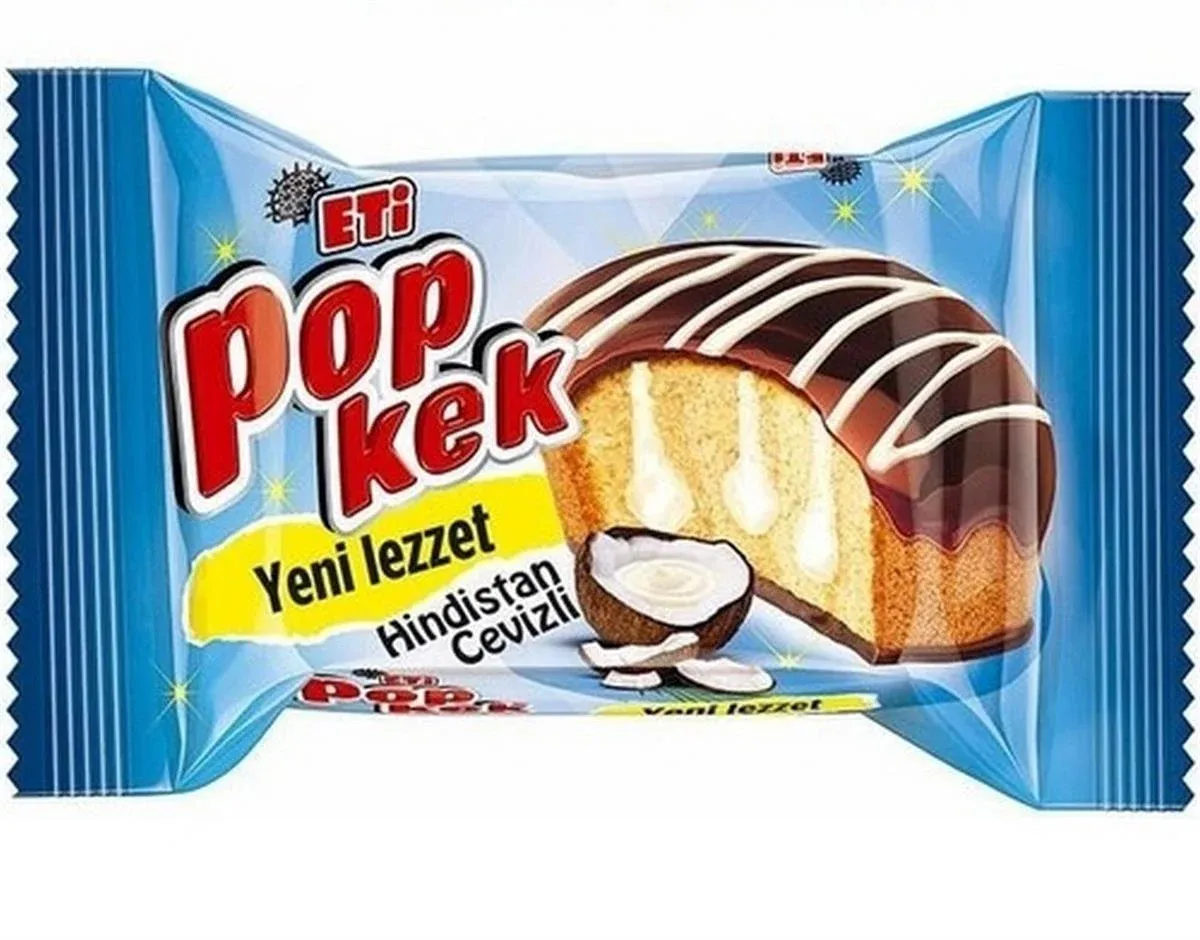 Eti Popkek Hindistan Cevizli Kek, yumuşacık ağızda dağılan keki, hindistan cevizi kremalı dolgusu ve çikolata kaplamasıyla damaklarda unutulmaz bir tat bırakır.